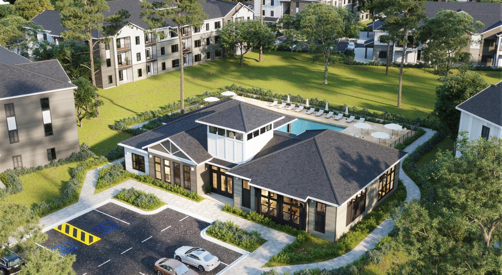 • a building with a lawn and trees