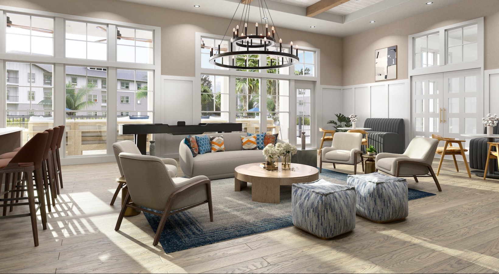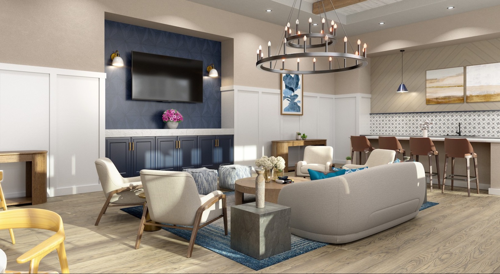 • a clubroom with couches, tables and chairs