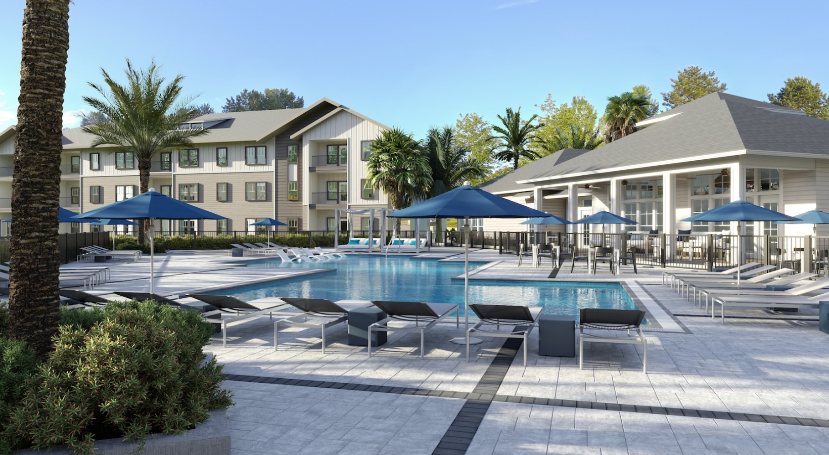 • a swimming pool with lounge chairs and umbrellas