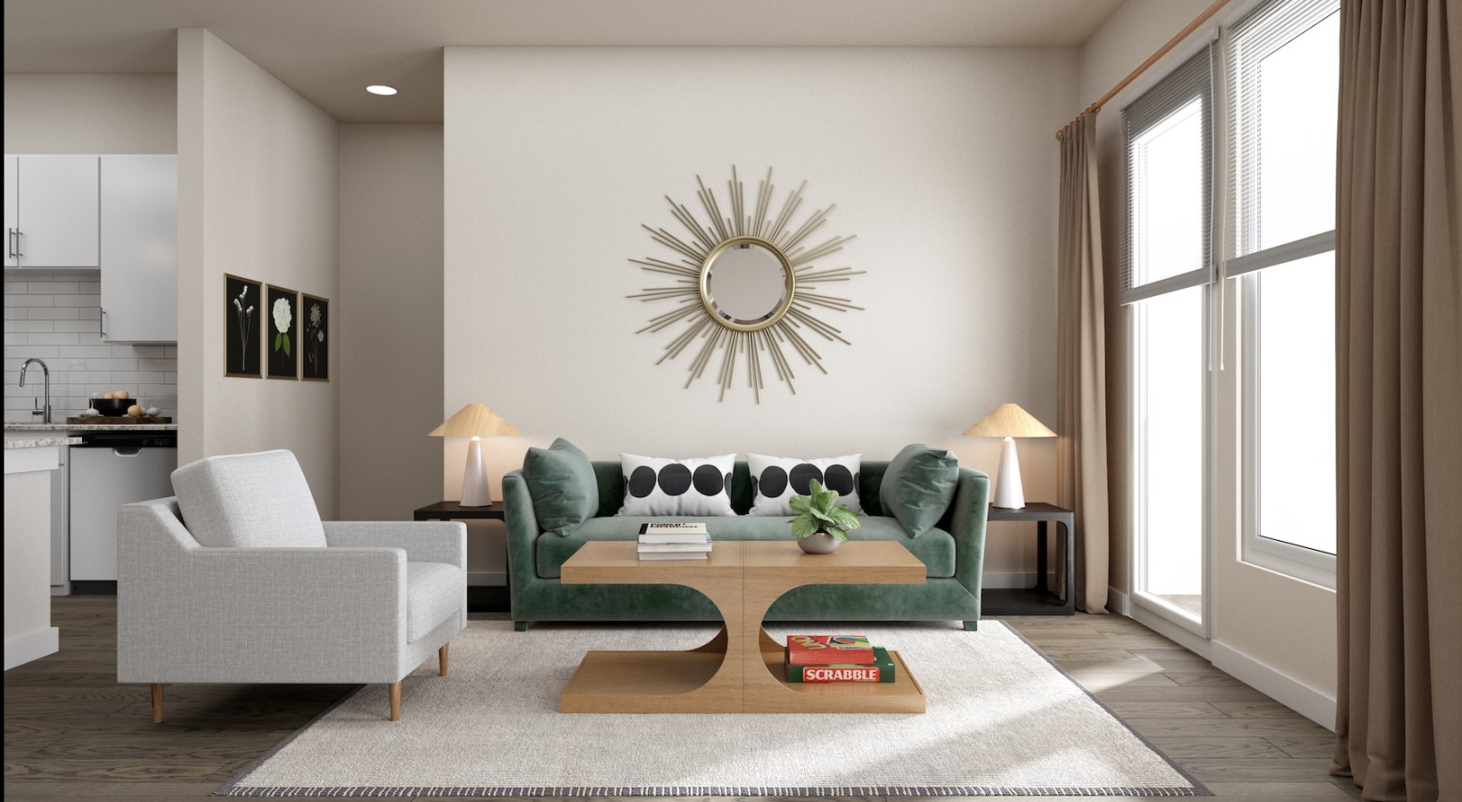• a living room with a green couch, a chair and a coffee table