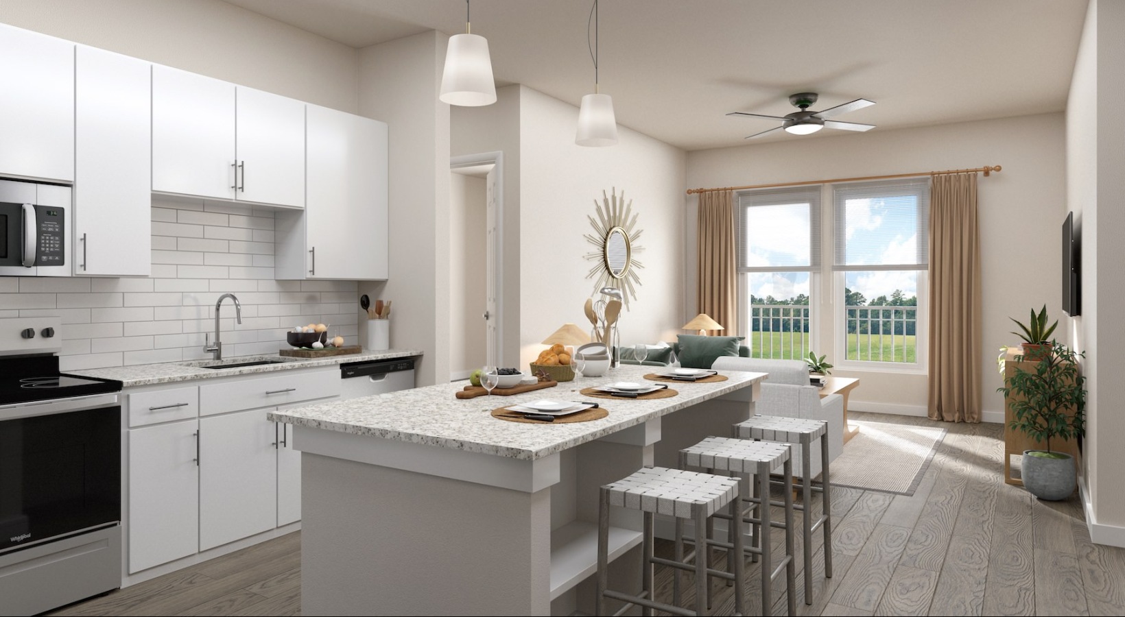 • a kitchen with white cabinets and an island